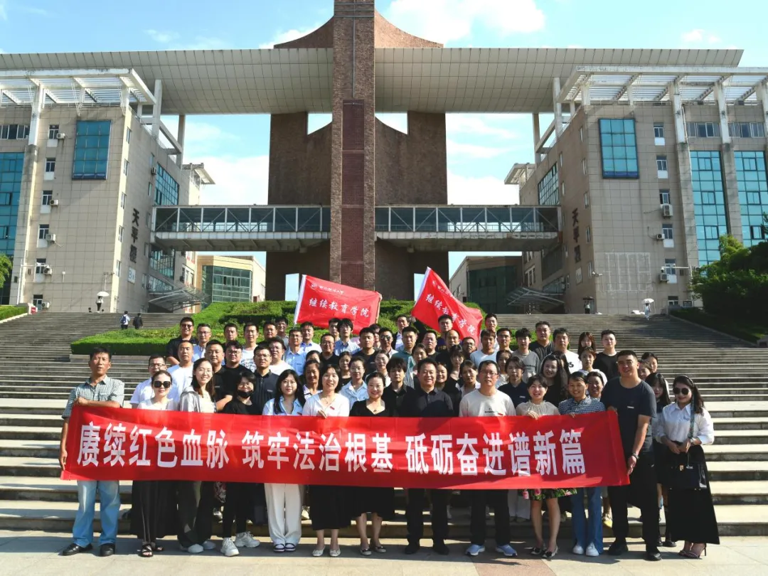 活动的终点定格于象征现代法治理念的“天平楼”前。师生们移步至这座庄重典雅的校园地标下,以高悬的巨型“天平”徽标为背景,展开“赓续红色血脉 筑牢法治根基 砥砺奋进谱新篇”的标语与院旗,留下了意义非凡的集体合影。天平楼巍然矗立,其名寓意“持法平如水”的司法理想,与师生们刚刚探访的张汤墓所承载的古代法治基因遥相呼应。